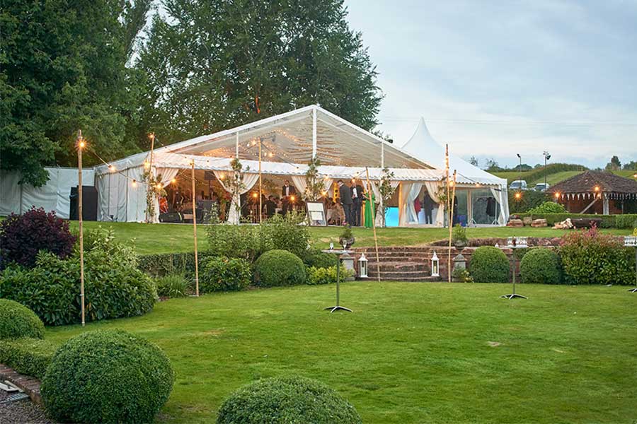 It was a beautiful summer’s day for a 21st birthday party in rural Worcestershire. Our 12m x 24m clearspan marquee on a 2.3m leg was nestled in the upper tier of the family garden behind the swimming pool. Ivory pleated linings were used to decorate throughout, augmenting the furniture, chess board dance floor and straight illuminated bar.