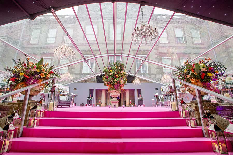 Some projects are just a dream to work on, and this wedding was one of those. Masterminded by Henry Bonas Events, this wedding at Ragley Hall was a truly collaborative build and an unforgettable experience. The 15m Premium marquee was split across two levels to incorporate the stone steps already in situ. A link to Ragley Hall was built at one end which utilised bespoke tack off lining and guttering. Above the link to Ragley we fitted a clear PVC roof, with a keder-fed Black Star lining covering the remainder of the marquee. Bespoke bathrooms were built with custom vacuum toilets and fittings. All the decor was designed and co-ordinated by the team at Henry Bonas Events, who were a pleasure to work with.