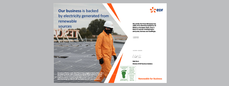 Sustainability has long been a part of Fews Marquees’ DNA, and ISO14001 accreditation was a natural progression for the business. Many processes were already in place, but this step ensured particular focus on our environmental footprint.