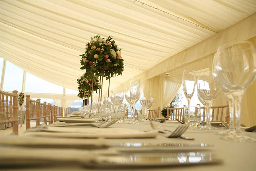 The main structure was a 15m x 21m clearspan marquee on 2.3m leg with ivory pleated lining to provide an elegant backdrop to the celebrations. The entrance was a 12m x 18m clearspan marquee on 2.3m leg with a 12m Hexagonal end and a clear roof above an illuminated oval bar. Stylish, integrated bathrooms underlined the feeling of luxury.