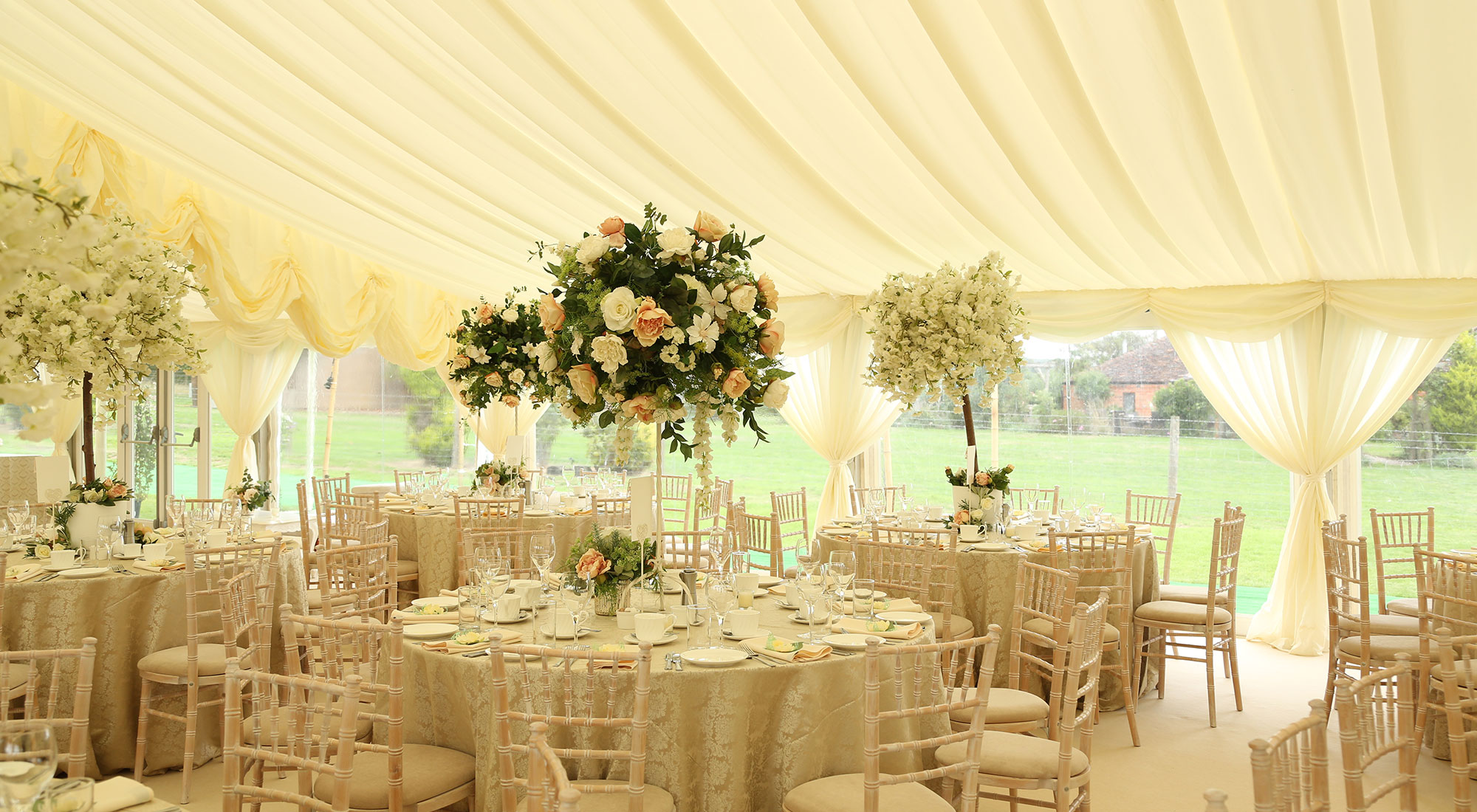 A beautiful summer’s day greeted the wedding of Carol and Brett in the heart of rural Worcestershire. The reception was held in a sumptuously dressed Fews Marquee at the family home in Defford.