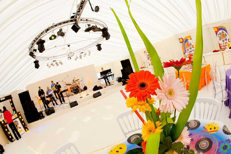 A Universal structure on 3m legs provided the perfect party area. Straight valances and white carpet ensured the bright colours really stood out.