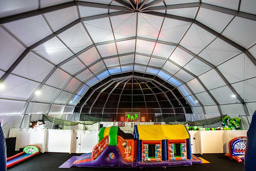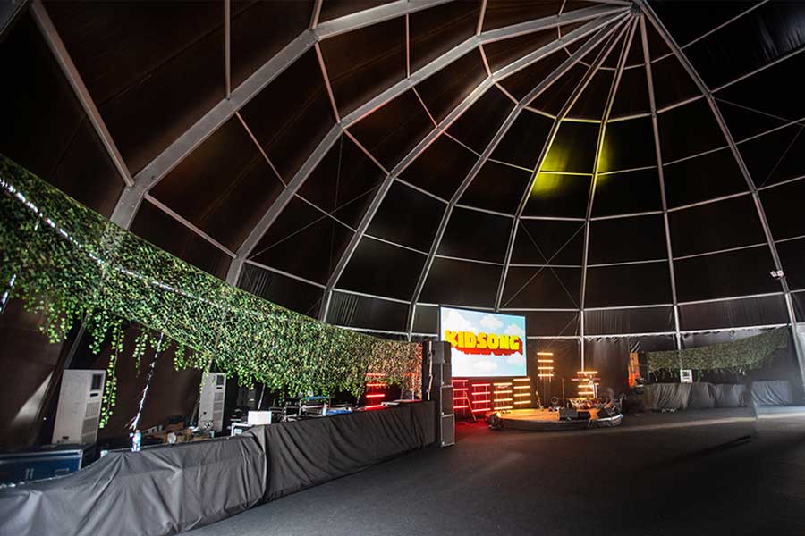 To house the Kidsong area we provided a 14m high 30m x 55m Igloo structure with a silver external / black internal roof sheet at the stage end and white roof sheeting over the remainder of the structure. This combination was to create the right environment – a split between play and performance areas. A cassette ring beam floor was installed covered by a new black carpet, and the area was divided by 2 x 30m timber partition walls to provide the areas for the different age groups. A 15m x 25m clearspan Premium structure was also provided as an additional marquee for the same purpose.