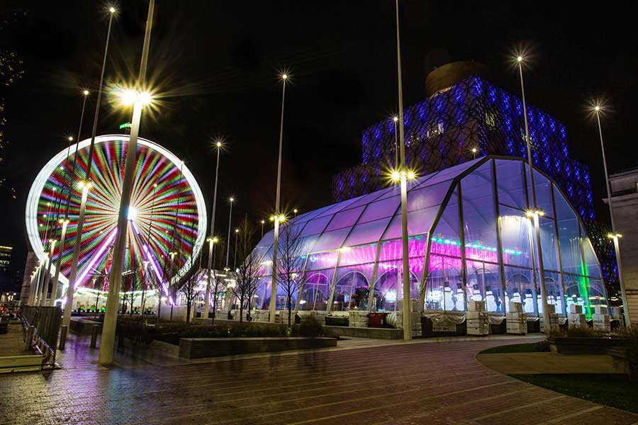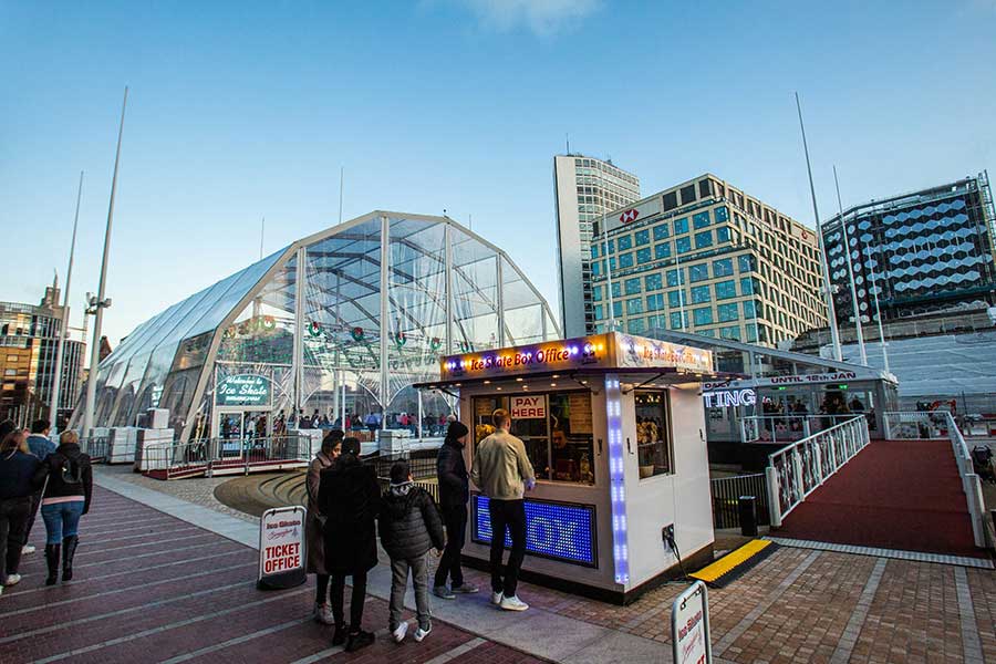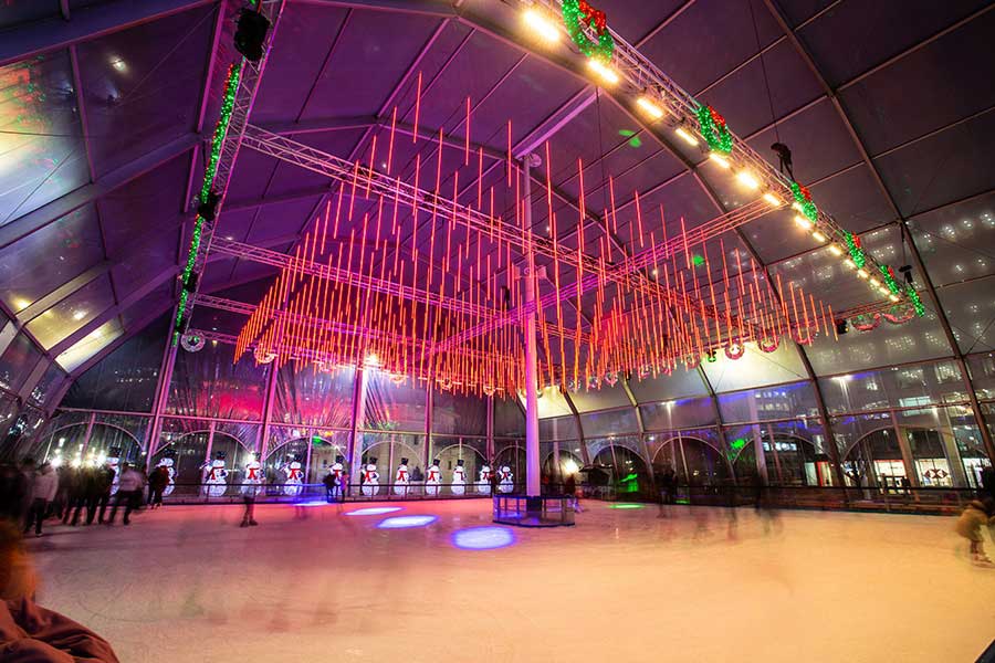We were approached by Ice Skate Birmingham to provide a visually stimulating and different structure to house the return of their ice rink to the original site at Centenary Square in Birmingham after a two year hiatus. In addition we were required to provide structures for the skate exchange and the “Sky Bar” area. There needed to be a clear point of difference from previous years and competitor events.