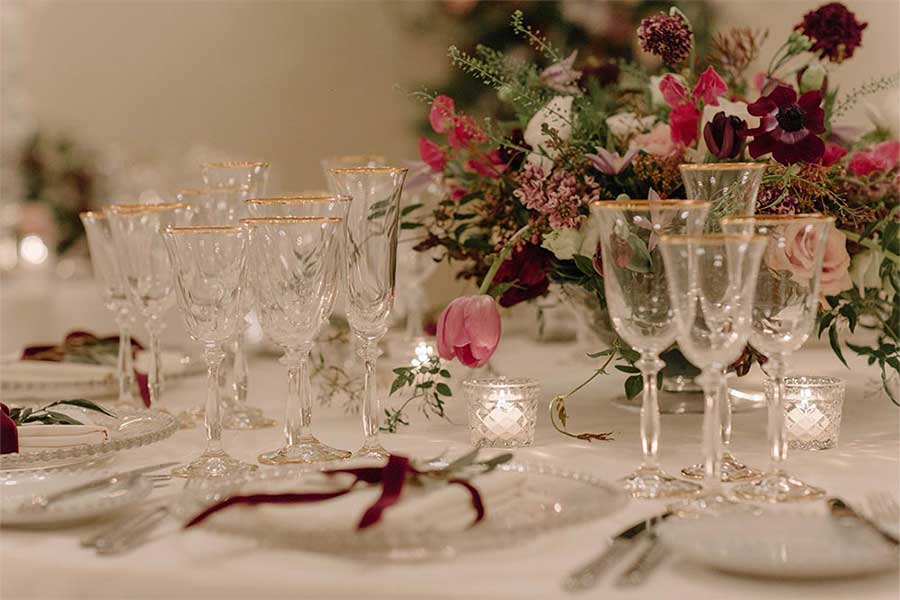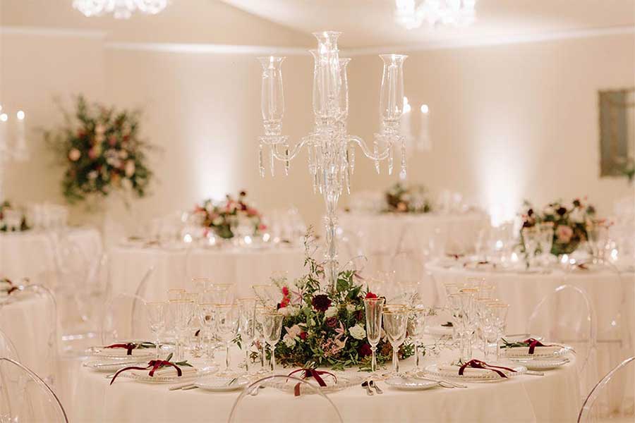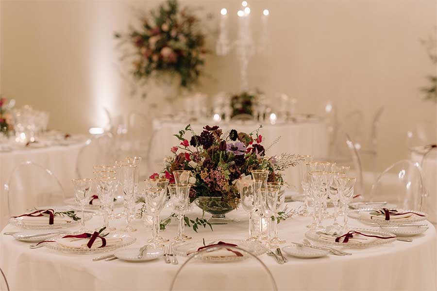 Round dining tables married with Victorian style ghost chairs, ivory linen and crystal candelabras created a chic finish with stunning floral decorations in berry shades, beaded charger plates and complimentary stationery completing the stunning look.
