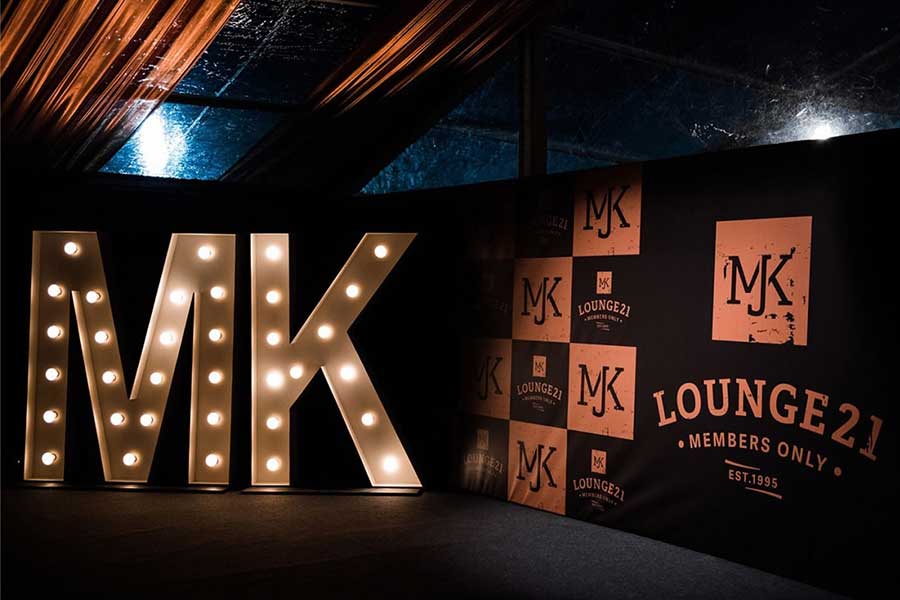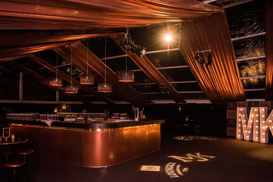 Lounge 21 comprised 2 principles marquee structures: A 25m x 25m Clearspan structure designated for drinking with bespoke copper draped clear roof, a central copper bar and oak barreled cocktail bar, bespoke printed wall panels carrying the “Lounge 21 Members Club” branding and branded gobos to finish the look.