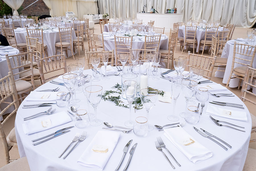 This elegant wedding beheld a breath-taking lakeside setting, with the main ceremony taking place overlooking the lake. Situated beside the designated ceremony seating area, a Fews marquee dressed with ivory linings and drapings complimented by white table clothes decorated gently to contribute towards the overall elegant complexion of the marquee. Hanging floral decorations placed above within the eaves of the marquee were a soothing addition to the overall complexion, transporting the remarkable nature of the surrounding grounds into the marquee, allowing for guests to venture into the marquee without forgetting the beautiful scenery surrounding the ceremony. A dance floor provided by Fews managed to draw every guest to their feet to dance the rest of the night away along with their newly-wed couple, catering to yet another unforgettable wedding.