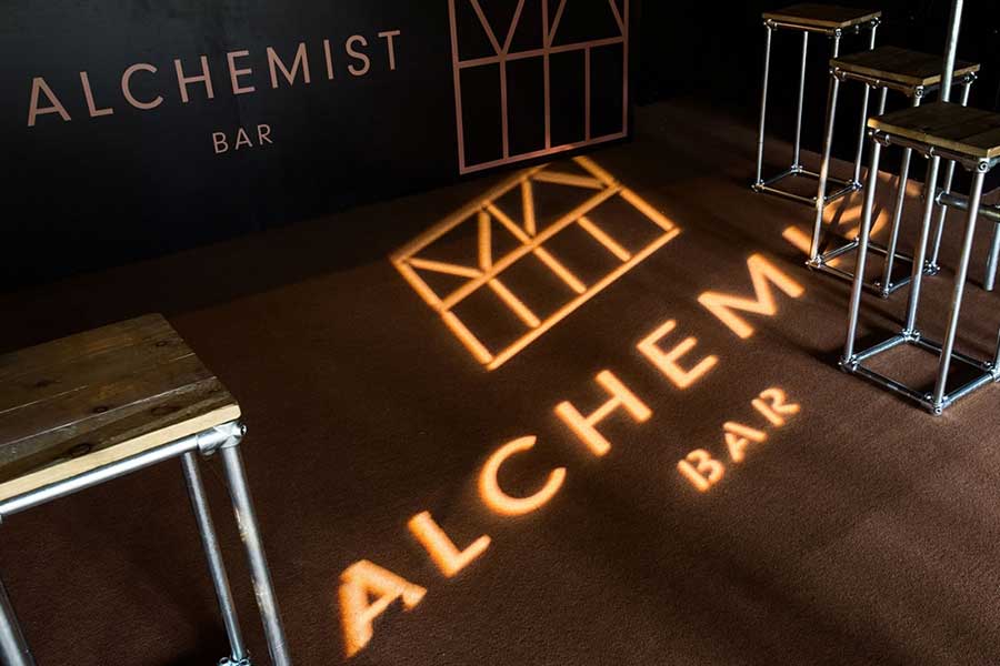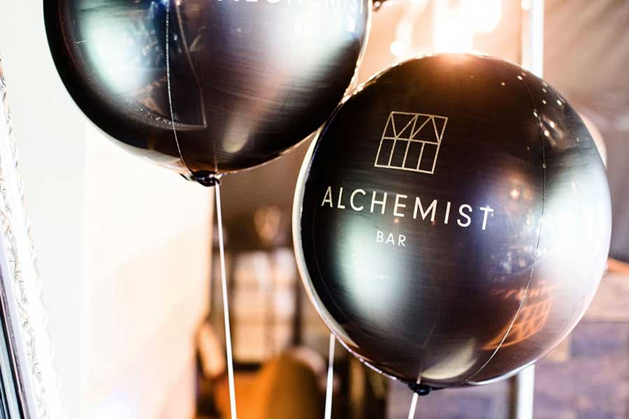 A festoon lined path way lead the guests to the Alchemist Bar which was created with bespoke branding featuring a geometric pattern spelling out the word Matt. This was matched through the décor on beer matts, bespoke gobo lights, branded cushions and table decorations. A floating periodic table featured over the dance floor with gold, copper and silver orbs carrying their respective values from the period table. Alchemist cocktails were served up by the team from So Cocktails, complete with dry ice and glow in the dark liquids pouring out of chemistry lab flasks.