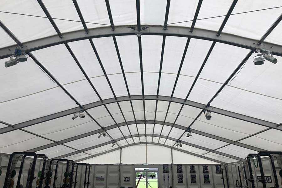Using a space at the side of the pitch, we constructed a 15m x 25m clear-span Premium structure with curved PVC roof on a 3m leg. To provide a solid and level base we fitted a cassette ring beam floor system with board finish.