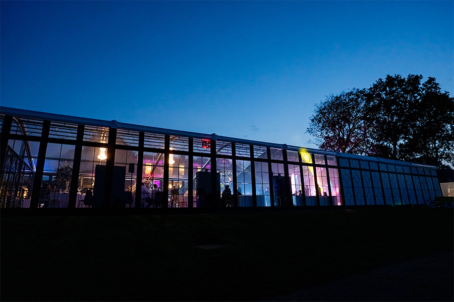 The 15m x 40m structure featured a sleek black frame and a dramatic clear gable end, allowing uninterrupted views of the surrounding landscape. As guests approached, they were greeted by an elegant exterior glass wall that subtly framed the entrance while providing wind protection without obstructing the view. The transparency of the marquee design brought the outdoors in, filling the space with natural light and creating a sense of airiness and connection to the rural setting.