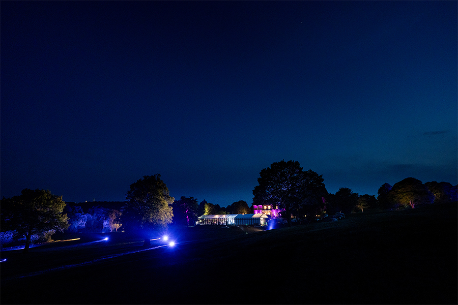 As day turned to evening, the marquee came alive beautiful lighting, amplified by the clear roof panels and glass walls.  A dramatic kabuki drop revealed a stage and band ready to entertain. Guests danced under the stars, with the transparent roof providing both shelter and a magical window to the night sky.