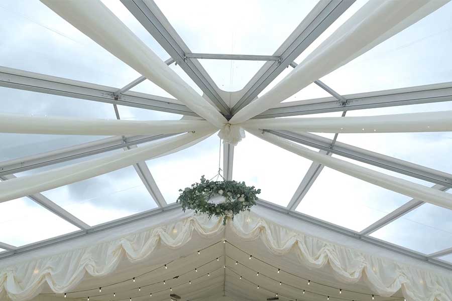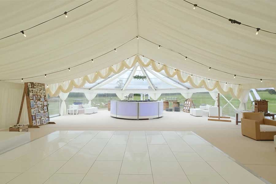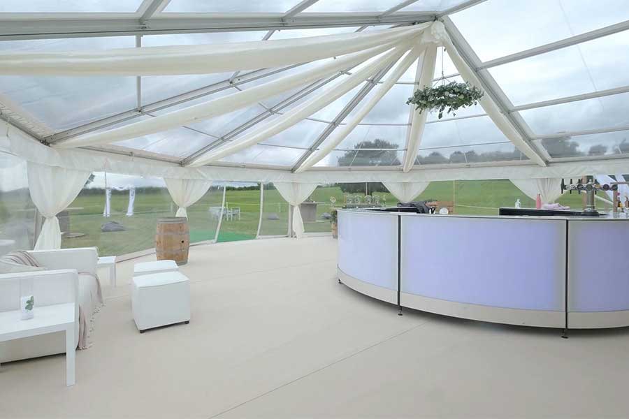 This exquisite marquee boasted a clear roof with a hexagonal end crowning the bar area, allowing natural light to infuse the space with warmth. Ivory pleated linings and sails adorned the interior, creating an atmosphere of refined sophistication.