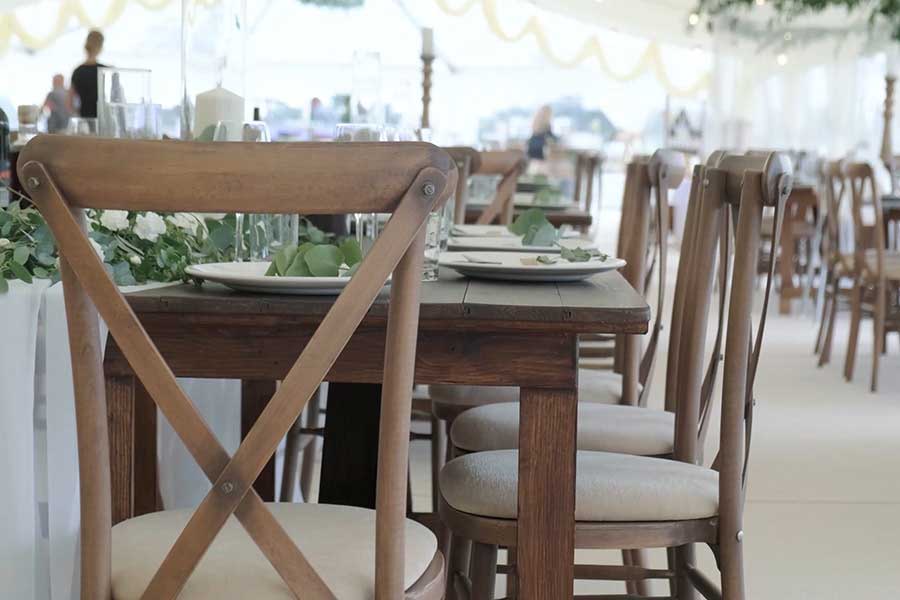 The heart of the celebration, featuring the top table and dining area, was refreshed with meticulously chosen furnishings. Cross-backed chairs and trestle tables were artfully arranged, seamlessly weaving the intrinsic rustic charm of the marquee into the fabric of the surrounding rural countryside.