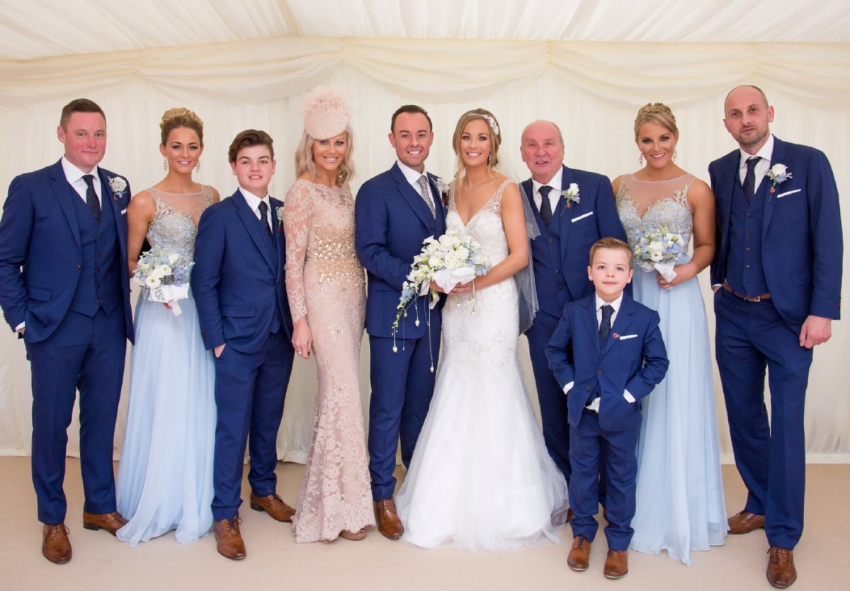 Wedding guests with bride and groom