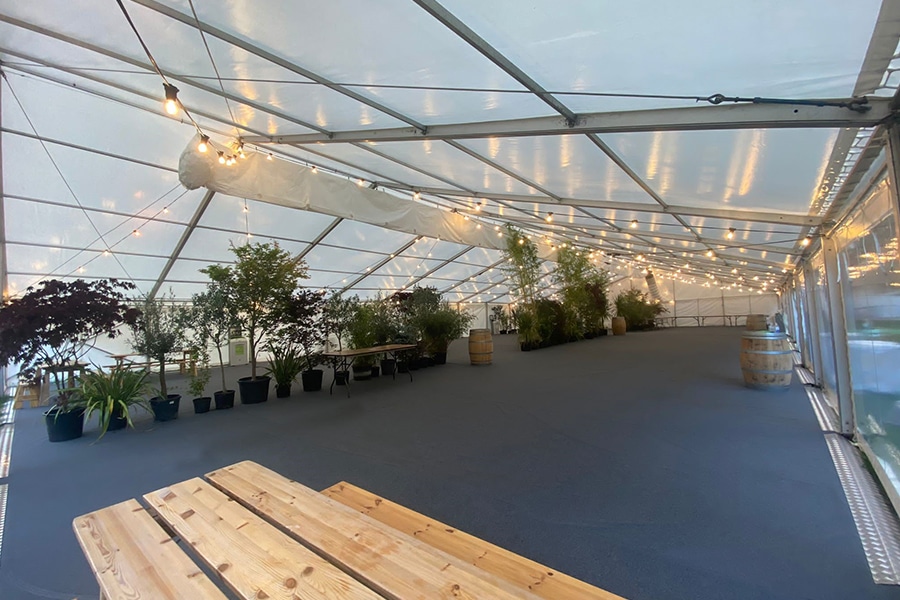 The 15m x 33m clear span marquee with clear window walls and a clear roof was fitted with a board floor and grey anthracite carpet.