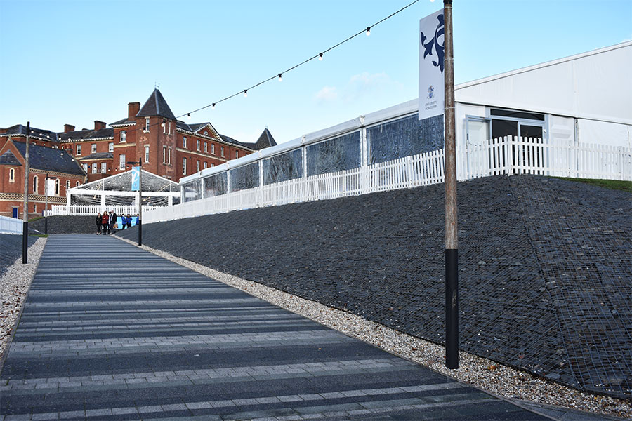 Fews provided five main structures placed around the campus including a 20m x 30m Clearspan Premium Structure with Curved PVC Roof on 3m Leg and a 12m x 33m Clearspan Marquee on 2.3m Leg. Each included entrances and service marquees.