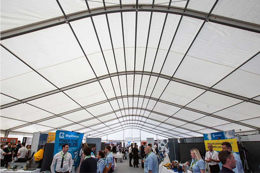 We used 15m, 20m and 25m wide Premium Structures with a curved PVC roofs on 3m legs for the entrance, kitchen, market place and catering areas. For the Liebherr exhibition stands we used three 5m x 5m Pagoda structures with glass and ABS wall panels.