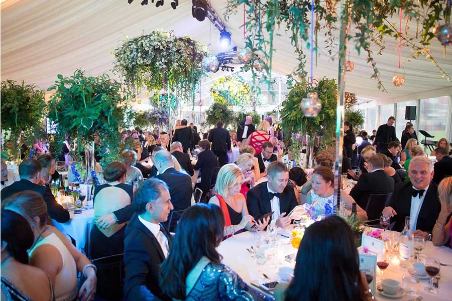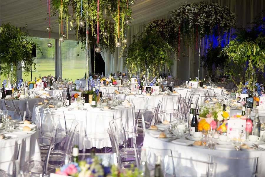 The marquee comprised of a 15m x 40m Clearspan Premium Structure with a 15m x 15m clear roof over the main bar. Clear walls ran throughout the dining area, flooding it with light and panoramic views of the school, with board floor and carpet in shades of pink and purple adding vibrancy to the design scheme.