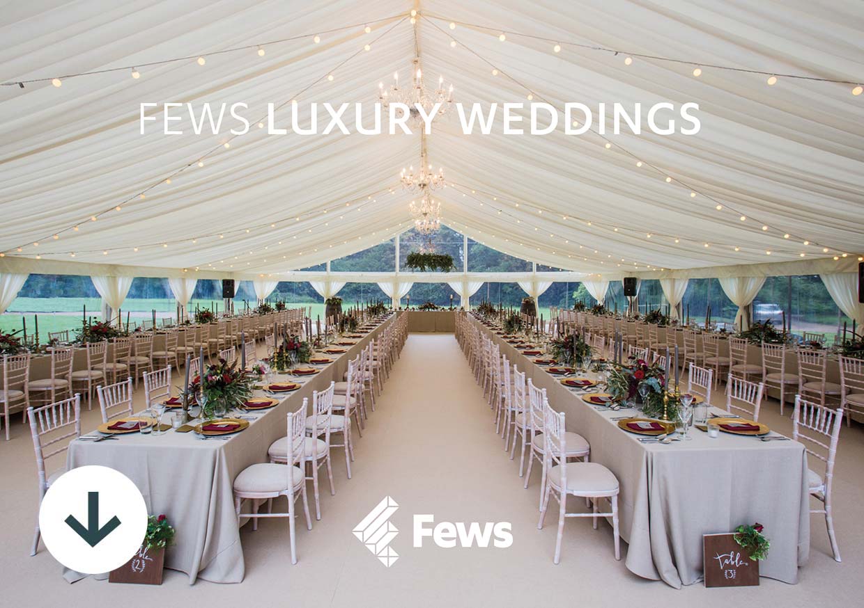 Fews are wedding marquee hire specialists. Our luxury wedding marquees can be installed in almost any location for short or long periods and can be designed to accommodate drinks receptions, dining, relaxation areas, staging and dance floors for entertainment and speeches. We love to take projects from concept to completion, working with you to design a completely unique wedding space to set the stage for your special day.