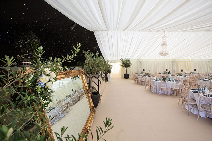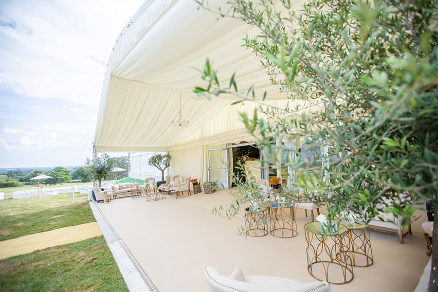 An entrance canopy was fitted comprising a 15m x 10m clear span premium structure with ivory pleated linings and champagne carpet allowing access to the main marquee via a ramp.