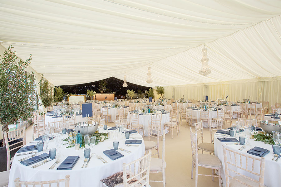 The main marquee was a 15m x 20m clear span premium structure with curved PVC roof on a 3m leg. Ivory pleated linings, limewash chivari chairs and a champagne carpet formed the basis of the interior décor, with the addition of flowers by Sophies Flowers. Lighting was provided by teardrop crystal chandeliers and 9 arm crystal chandeliers on a dimmer control.